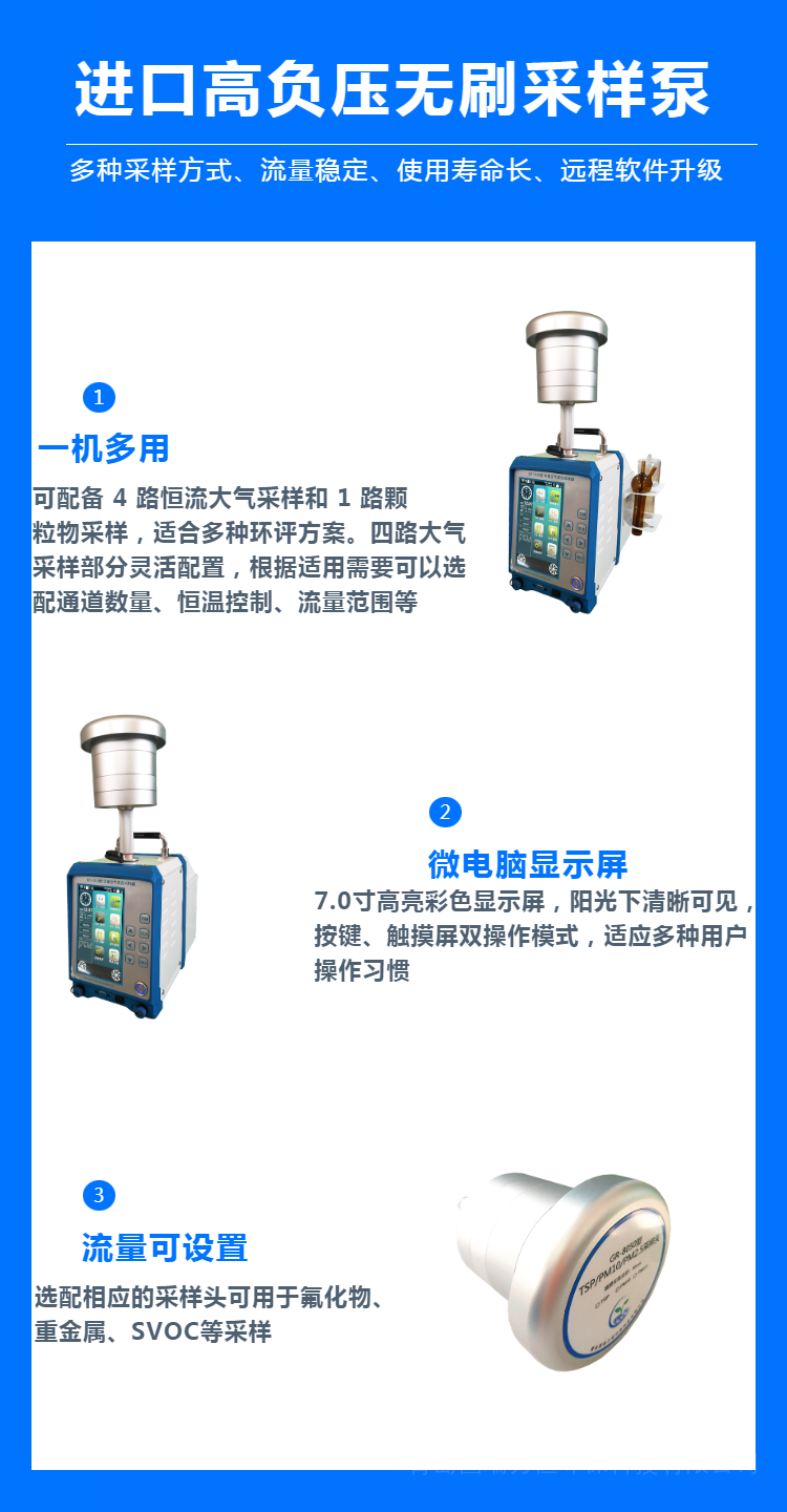 ● 颗粒物采样流量可设置,选配相应的采样头可用于氟化物、重金属、SVOC等的采样