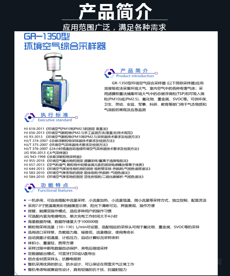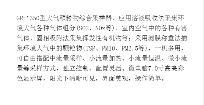 环境空气总悬浮颗粒物采样器 GR-1350D型环境空气综合采样器 (以下简称采样器)应用溶液吸收法采集环境大气、室内空气中的各种有害气体;采用滤膜称重法捕集环境大气中的总悬浮微粒(TSP)和可吸入微粒( PM10)或(PM2.5)、氟化物、重金属、SVOC等。可供环保、卫生、劳动、安监、科研、教育等部门用于气态物质和气溶胶的常规及应急监测