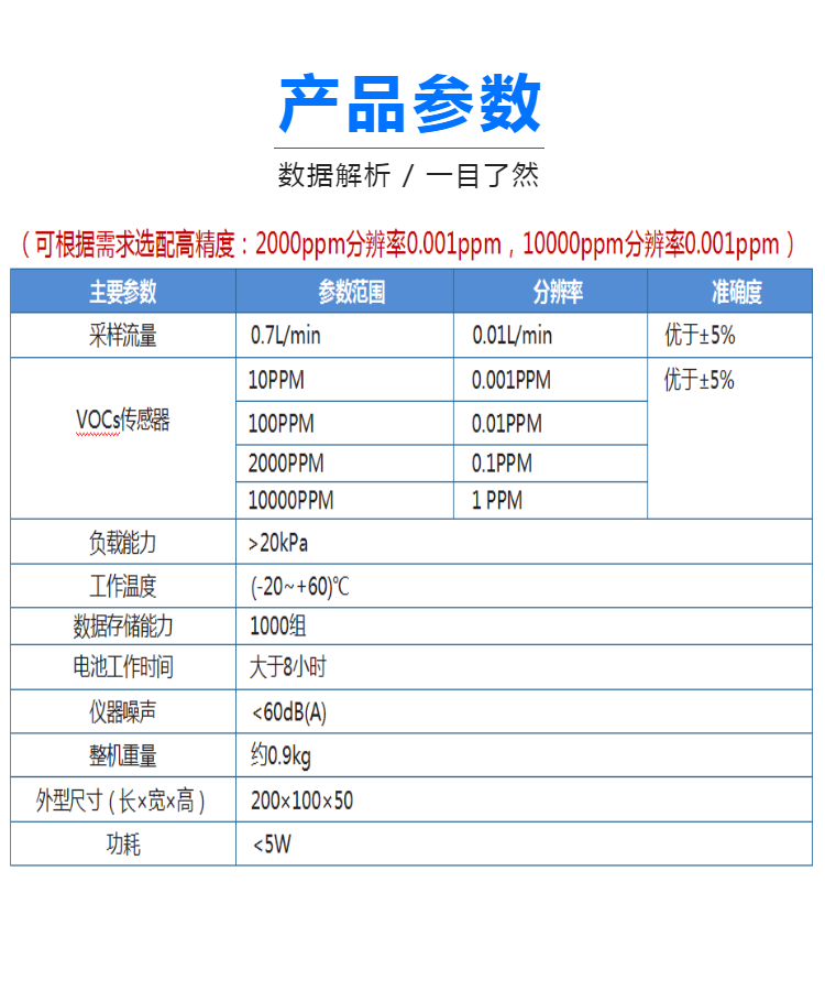 (可根据需求选配高精度:2000ppm分辨率0.001ppm,10000ppm分辨率0.001ppm)主要参数 参数范围 分辨率 准确度 采样流量 0.7L/min 0.01L/min 优于±5% VOCs传感器 20PPM 0.001PPM 优于±5% 200PPM 0.01PPM 2000PPM 0.1PPM 10000PPM 0.1PPM 负载能力 >20kPa 工作温度 (-20~+60)℃ 数据存储能力 1000组 电池工作时间 大于8小时 仪器噪声 <60dB(A) 整机重量 约0.9kg 外型尺寸(长×宽×高) 200×100×50 功耗 <5W -
