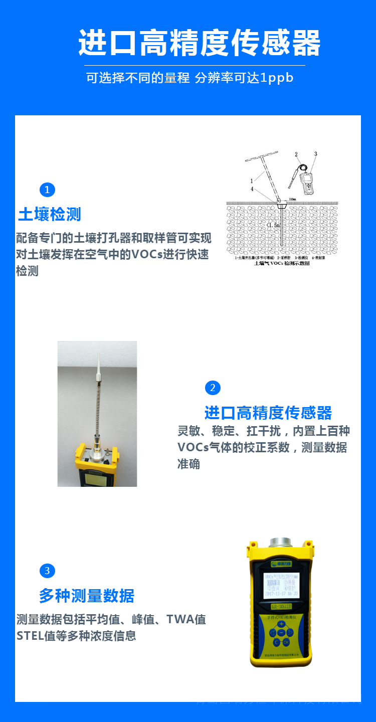 适用于环境空气,应急(泄漏)事故监测、职业卫生场所、石化企业安全检测以及储罐、管道、阀门泄漏检测等的总挥发性有机物浓度。配备专门的土壤打孔器和取样管可实现对土壤挥发在空气中的有机挥发性气体进行快速检测。