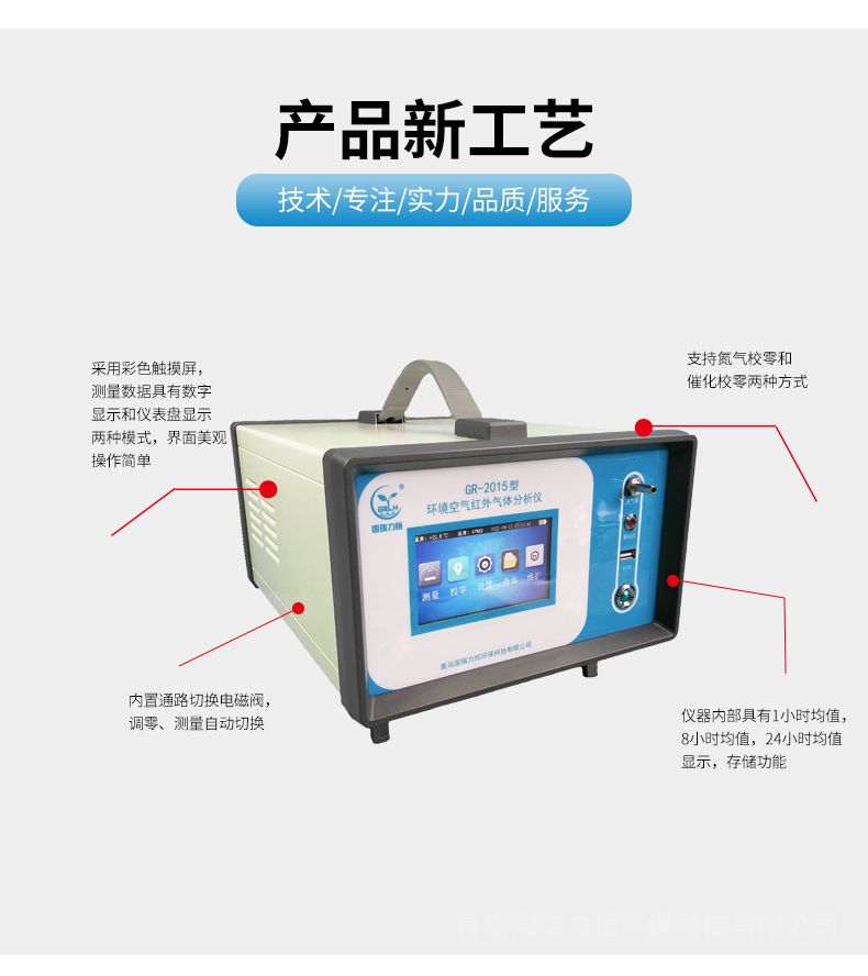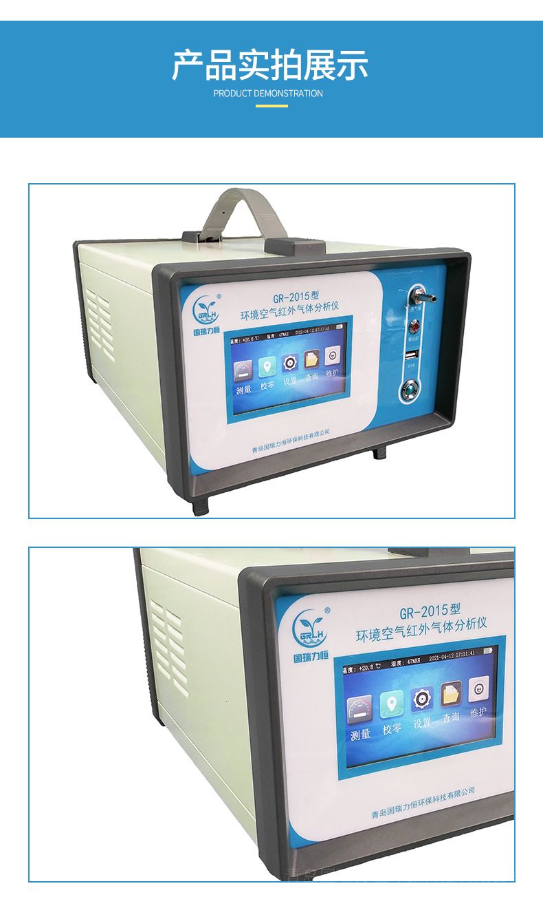 国瑞力恒红外一氧化碳、二氧化碳二合一分析仪GR-2015型环境空气红外气体分析仪(以下简称分析仪) 采用不分光红外分析法/非分散红外法(NDIR)测量空气中 的CO、CO2浓等的浓度,具有测量精度高,使用寿命长,交叉干扰小等优点,本仪器符合JJG635-2011《一氧化碳、二氧化碳红外线气体分析器》的计量检定规程,主要的技术指标符合二级仪表的技术要求,可以取得中国计量科学研究院的检定证书(检定结论:合格,该仪器符合二级技术要求)