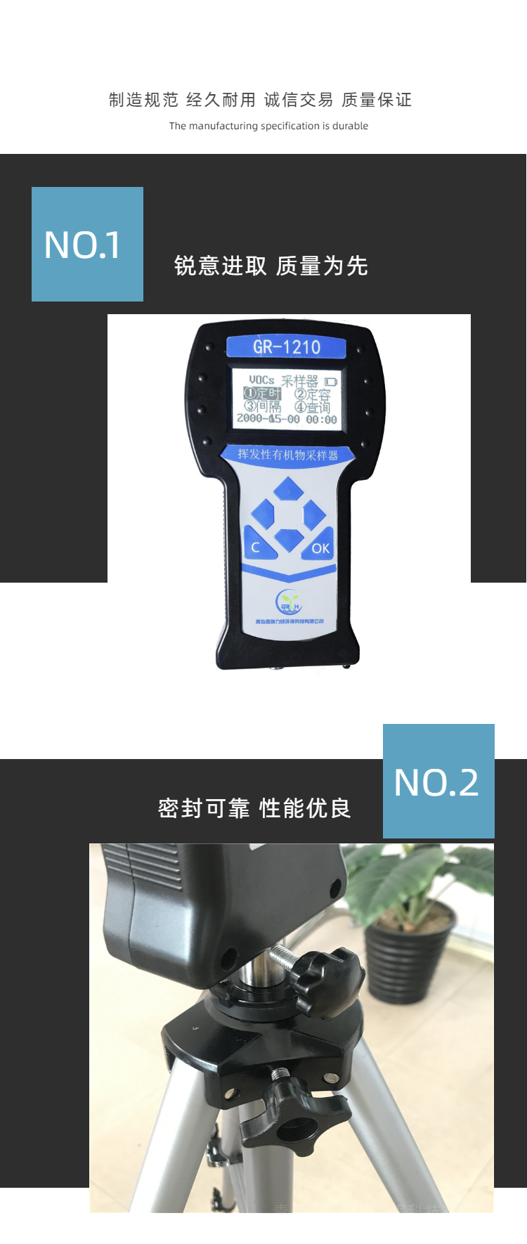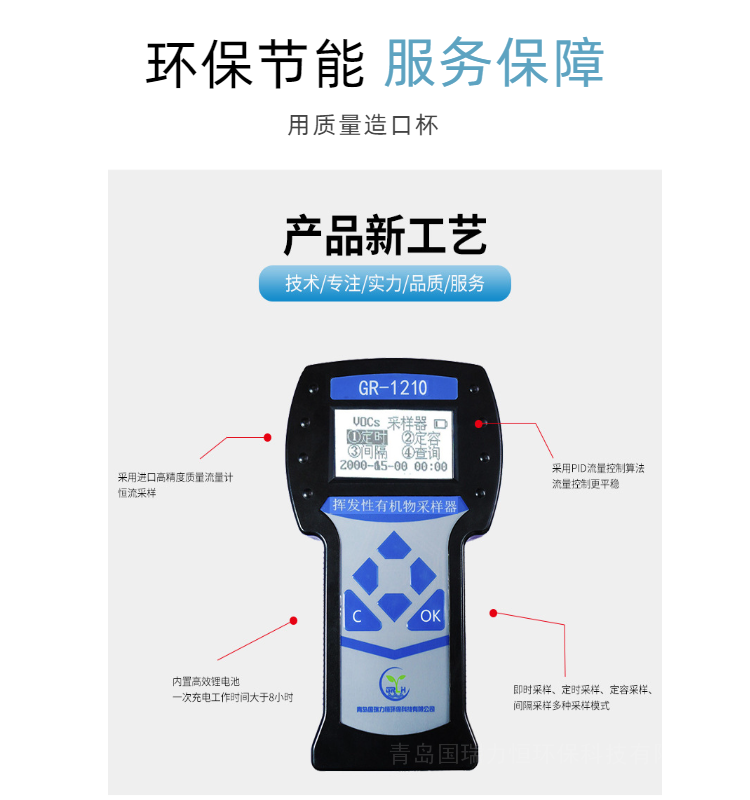 国瑞力恒小流量VOCs气体采样器GR-1210 型挥发性有机物采样器(以下简称采样器)是我公司针对环境空气、工作场所、工业生产有组织排放中的挥发性有机物采样进行研发的专用采样器。该采样器是环境空气中的TVOCs、苯、甲苯、二甲苯等多种有机物专用采样设备,采样器的技术性能指标符合国家颁布的有关标准的规定。研制过程中广泛征求了专家及广大用户的意见,应用高性能处理器、进口采样泵、高精度质量流量传感器及新材料领域的高新技术,竭力为用户提供一台质量可靠、性能稳定的高品质采样器