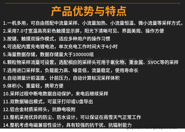 ● 颗粒物采样流量可设置,选配相应的采样头可用于氟化物、重金属、SVOC等的采样