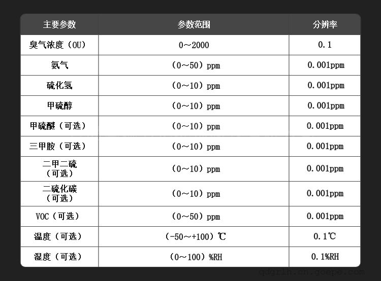 主要参数 参数范围 分辨率 准确度 臭气浓度(OU) 0~2000 0.1 氨气 (0-50)ppm 0.001ppm 硫化氢 (0-10)ppm 0.001ppm 甲硫醇 (0-10)ppm 0.001ppm 甲硫醚(可选) (0-10)ppm 0.001ppm 三甲胺(可选) (0-10)ppm 0.001ppm 二甲二硫(可选) (0-10)ppm 0.001ppm 二硫化碳(可选) (0-10)ppm 0.001ppm 苯乙烯(可选) (0-10)ppm 0.001ppm VOC(可选) (0-50)ppm 0.001ppm 颗粒物PM10(可选) (0~1000)ug/m3 0.1ug/m3 颗粒物PM2.5(可选) (0~1000)ug/m3 0.1ug/m3 温度(可选) (-50~+100)℃ 0.1℃ 湿度(可选) (0~100)%RH 0.1%RH 数据存储能力 5000组 电池工作时间 大于8小时 仪器噪声 <55dB(A) 整机重量 < 4.5kg 主机尺寸(mm ) 255×165×340 功耗 <15W -